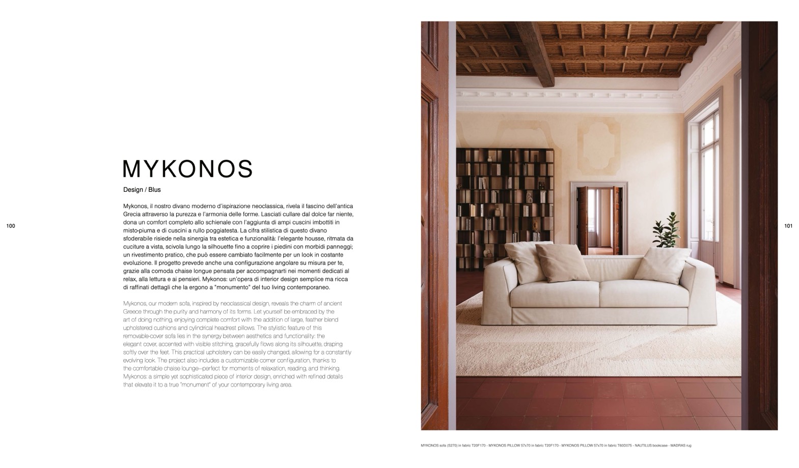 Mykonos, our modern sofa, inspired by neoclassical design, reveals the charm of ancient