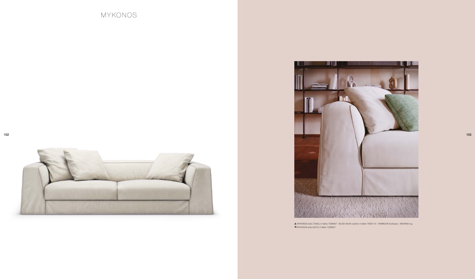 MYKONOS sofa (T230L) in fabric T20B057 - BLISS 45x45 cushion in fabric T80D110 - HARBOUR bookcase - MADRAS rug