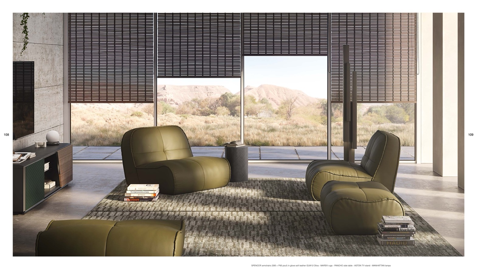 SPENCER armchairs (S95 + P95 pouf) in glove soft leather GLW12 Oliva - MAREK rugs - PANCHO side table - ASTON TV stand - MANHATTAN lamps