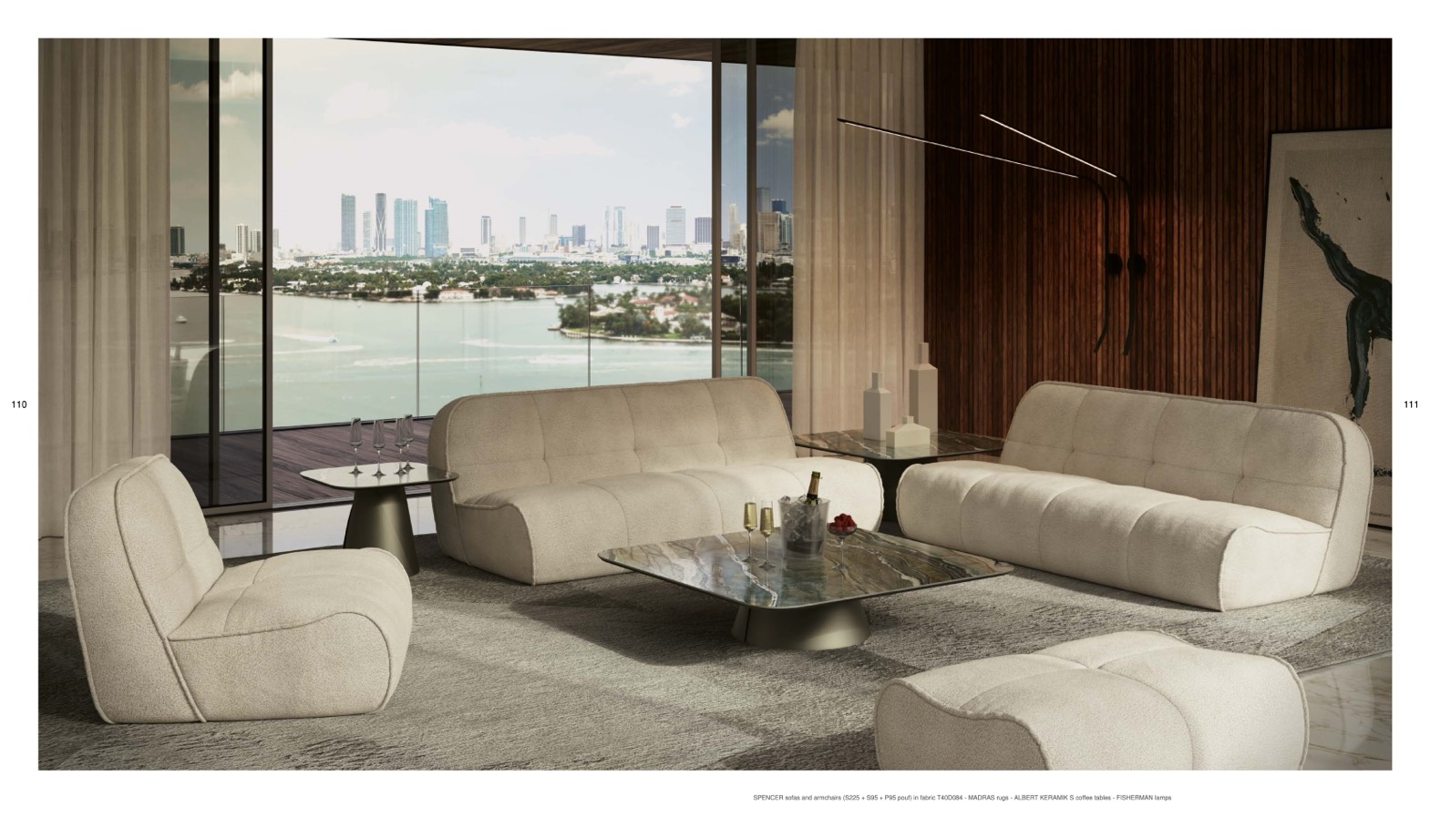 SPENCER sofas and armchairs (S225 + S95 + P95 pouf) in fabric T40D084 - MADRAS rugs - ALBERT KERAMIK S co