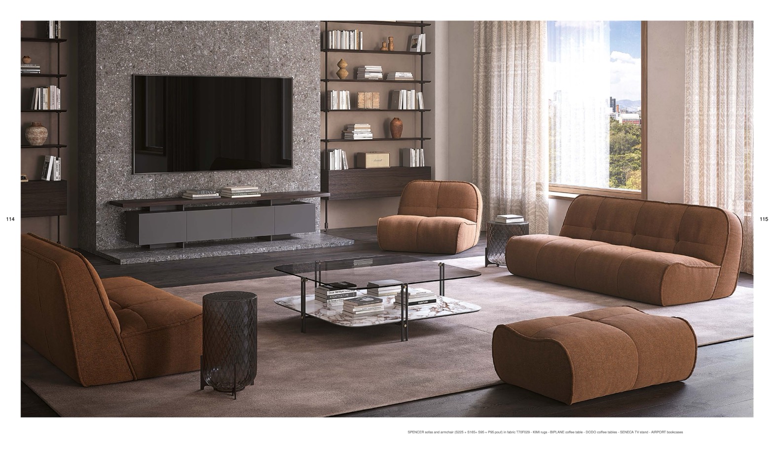SPENCER sofas and armchair (S225 + S165+ S95 + P95 pouf) in fabric T70F029 - KIMI rugs - BIPLANE coffee table - DODO coffee tables - SENECA TV stand - AIRPORT bookcases