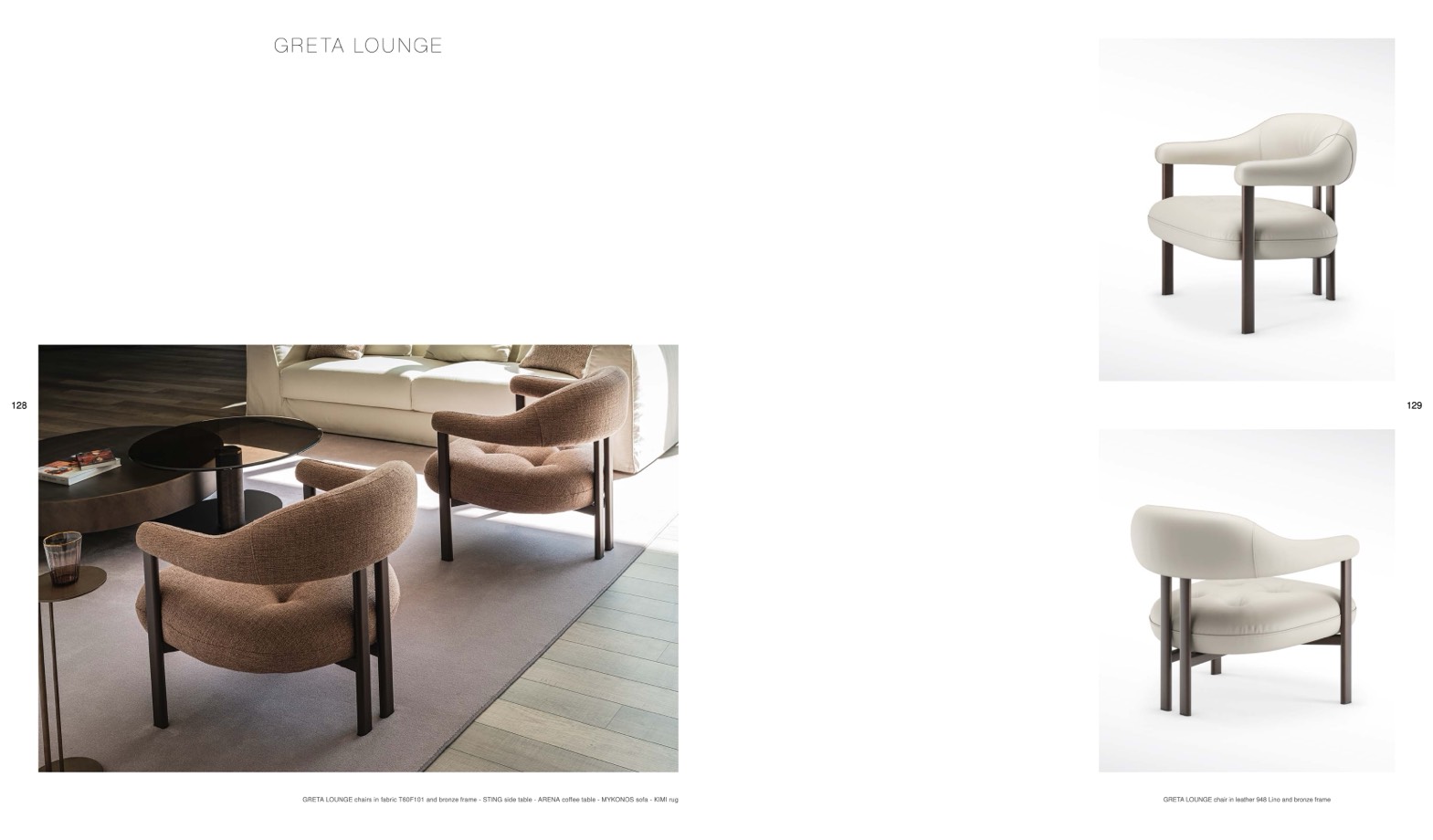 GRETA LOUNGE chairs in fabric T60F101 and bronze frame - STING side table - ARENA coffee table - MYKONOS sofa - KIMI rug