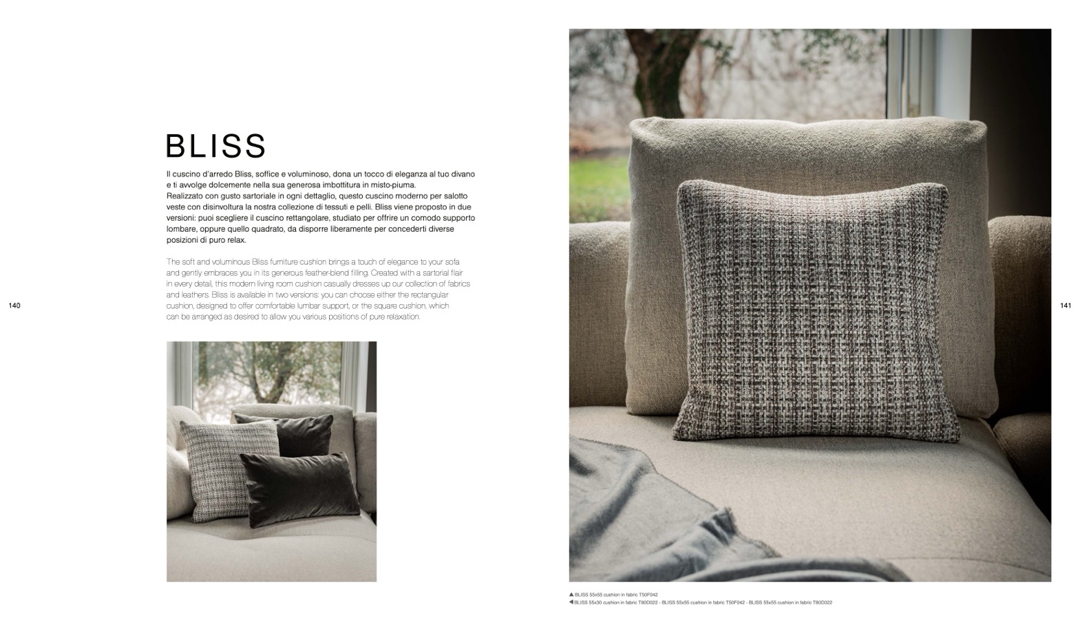 BLISS 55x30 cushion in fabric T80D022 - BLISS 55x55 cushion in fabric T50F042 - BLISS 55x55 cushion in fabric T80D022