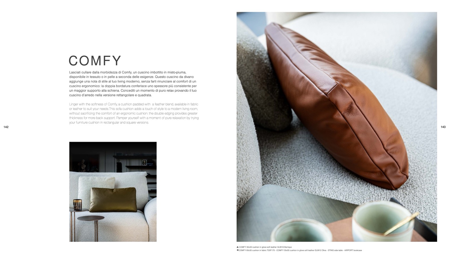 COMFY 65x30 cushion in fabric T20F170 - COMFY 55x55 cushion in glove soft leather GLW12 Oliva - STING side table - AIRPORT bookcase