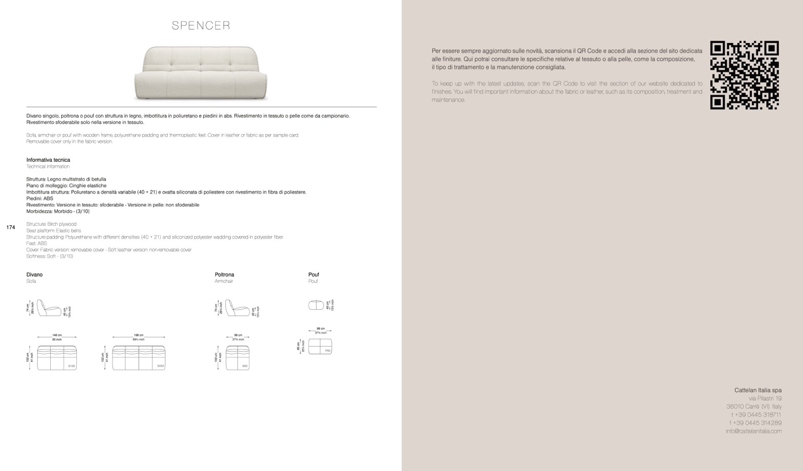 Sofa, armchair or pouf with wooden frame, polyurethane padding and thermoplastic feet. Cover in leather or fabric as per sample card.