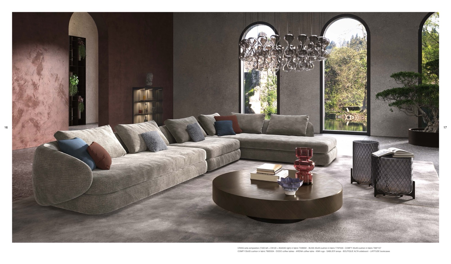 CRAIG sofa composition (T220 left + CN120 + AGA240 right) in fabric T30B091 - BLISS 45x45 cushion in fabric T70F029 - COMFY 45x45 cushion in fabric T80F107