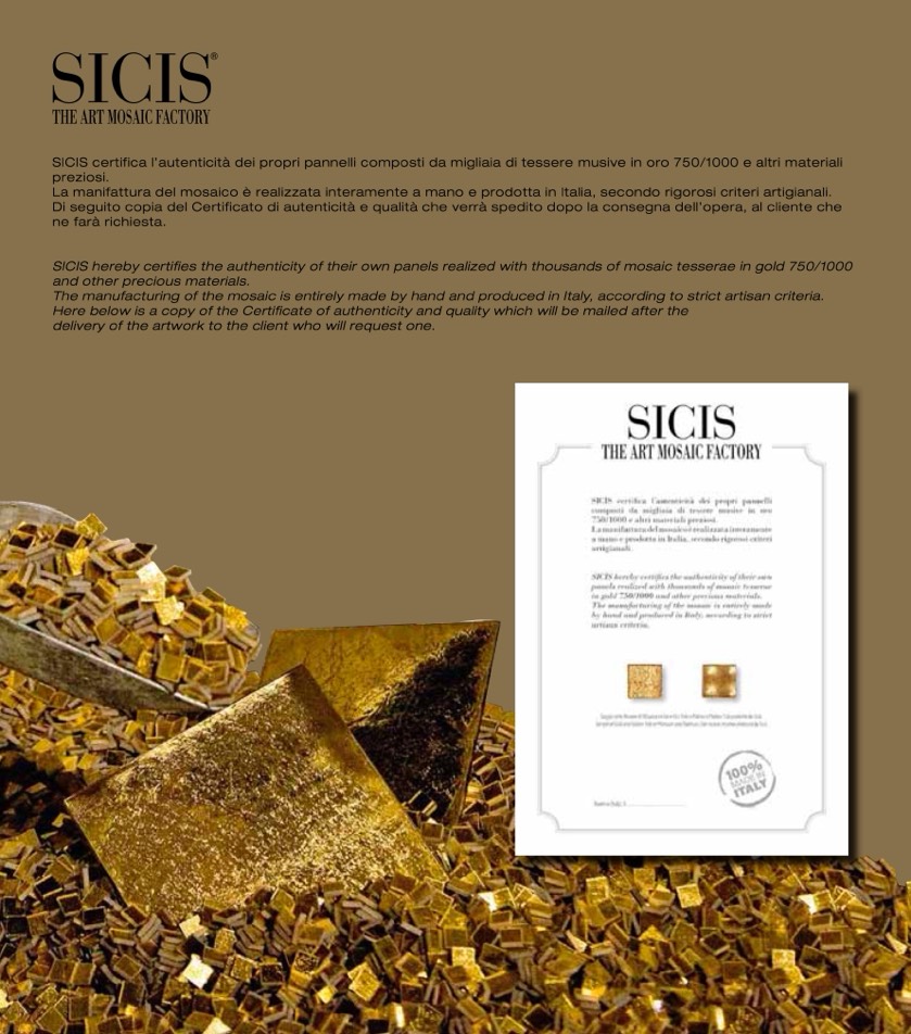 SICIS hereby certifies the authenticity of their own panels realized with thousands of mosaic tesserae in gold 750/1000