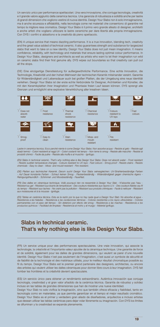 (EN) Slabs in technical ceramic. That’s why nothing else is like Design Your Slabs: Does not absorb water - Frost resistant