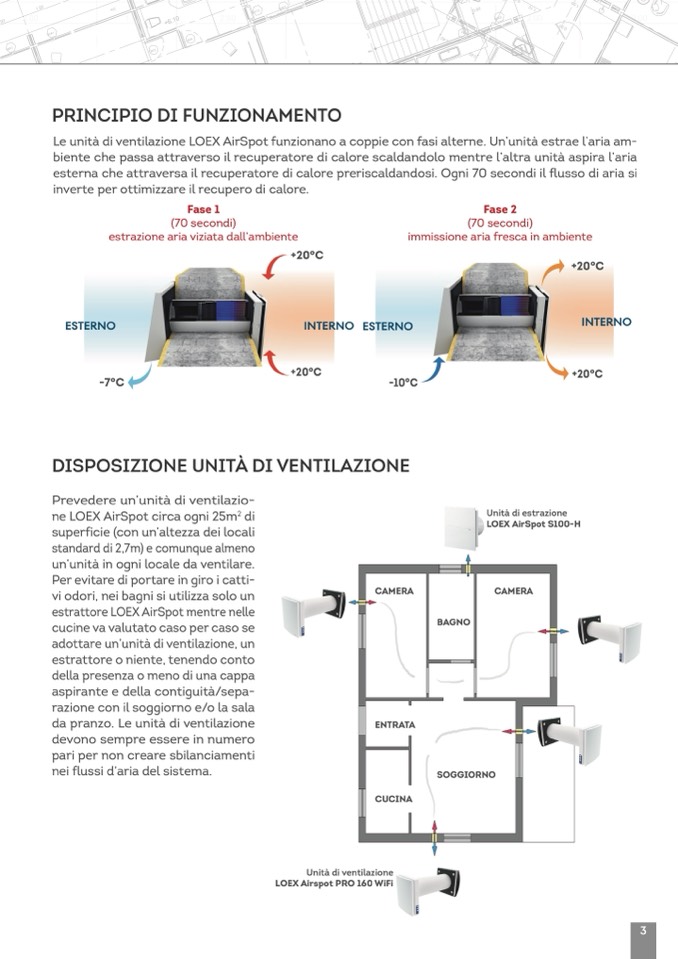 Le unità di ventilazione LOEX AirSpot funzionano a coppie con fasi alterne. Un’unità estrae l’aria am-