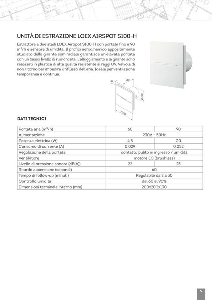 m3/h e sensore di umidità. Il profilo aerodinamico appositamente