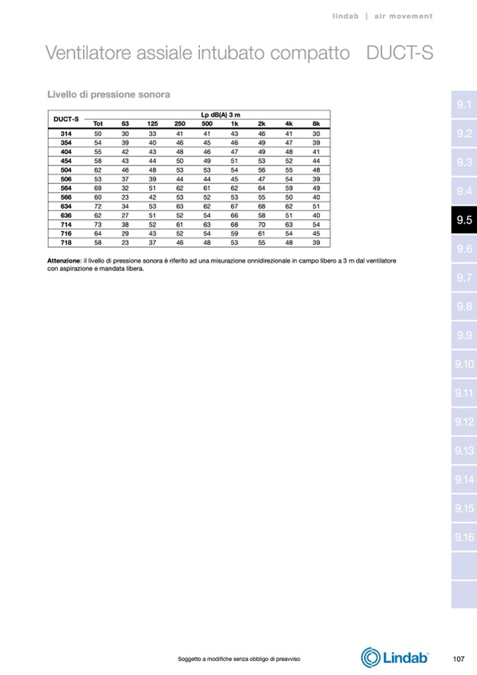 Attenzione: il livello di pressione sonora è riferito ad una misurazione onnidirezionale in campo libero a 3 m dal ventilatore