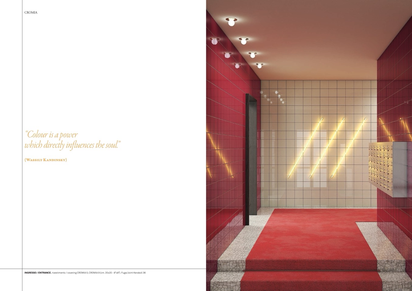 INGRESSO / ENTRANCE, rivestimento / covering CROMIA 5, CROMIA 9 (cm. 20x20 - 8”x8”). Fuga/Joint Kerakoll 36