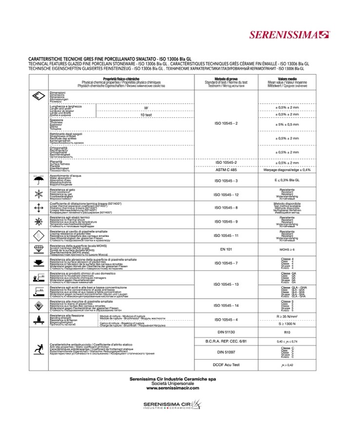 TECHNICAL FEATURES GLAZED FINE PORCELAIN STONEWARE - ISO 13006 BIa GL . CARACTÉRISTIQUES TECHNIQUES GRÈS CÉRAME FIN ÉMAILLÉ - ISO 13006 BIa GL