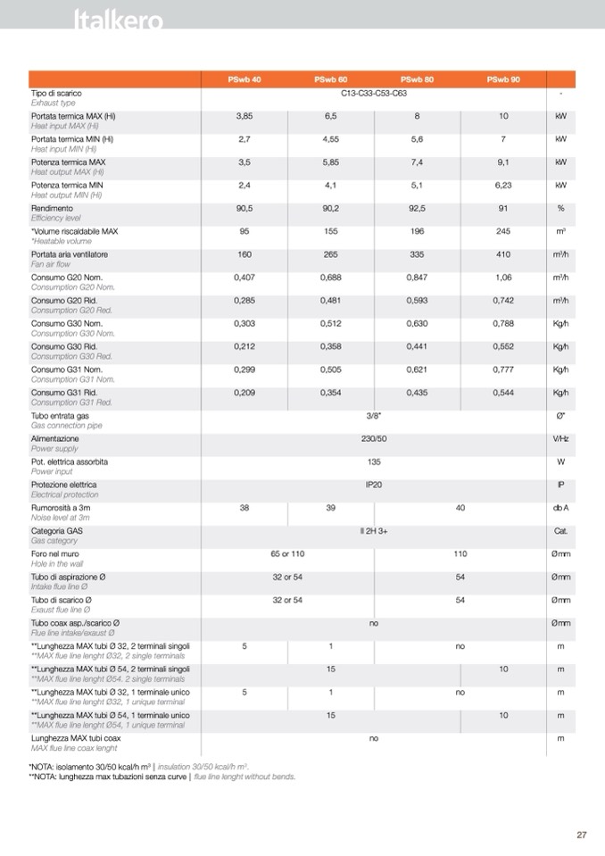 **nOta: lunghezza max tubazioni senza curve | flue line lenght without bends.