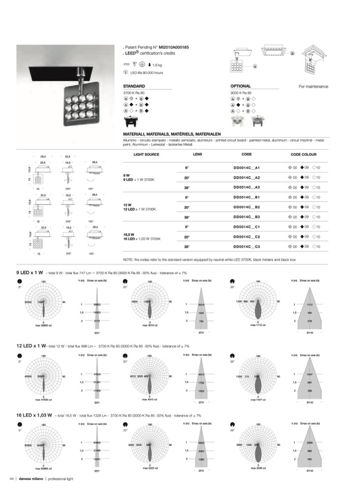 NOTE: the codes refer to the standard version equipped by neutral white LED 3700K, black holders and black box