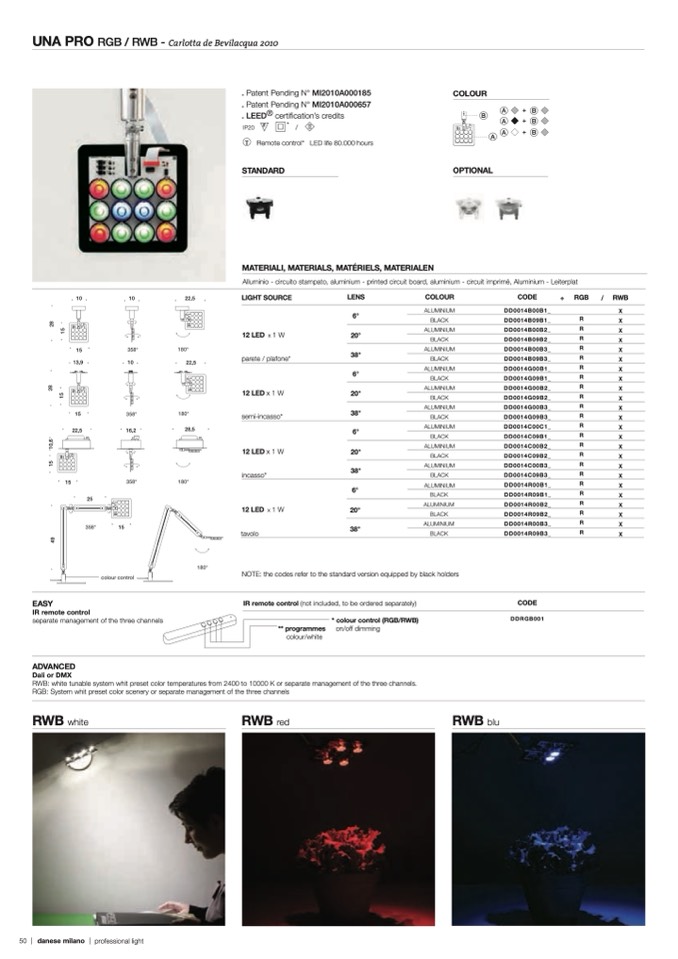 RWB: white tunable system whit preset color temperatures from 2400 to 10000 K or separate management of the three channels.