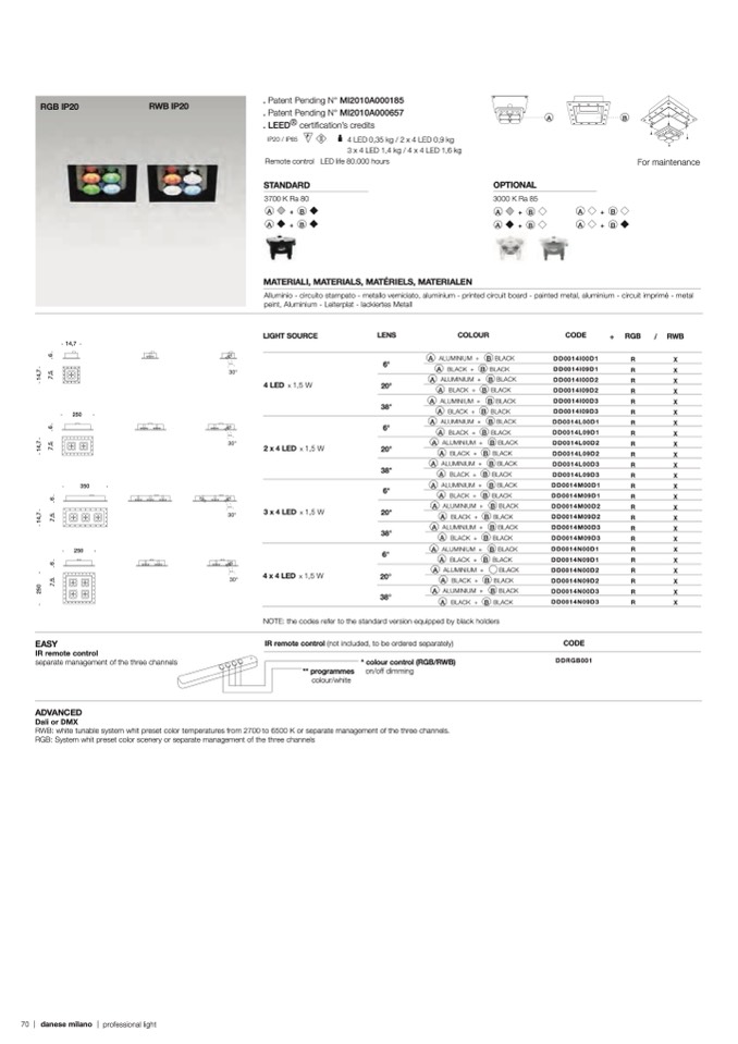 RWB: white tunable system whit preset color temperatures from 2700 to 6500 K or separate management of the three channels.