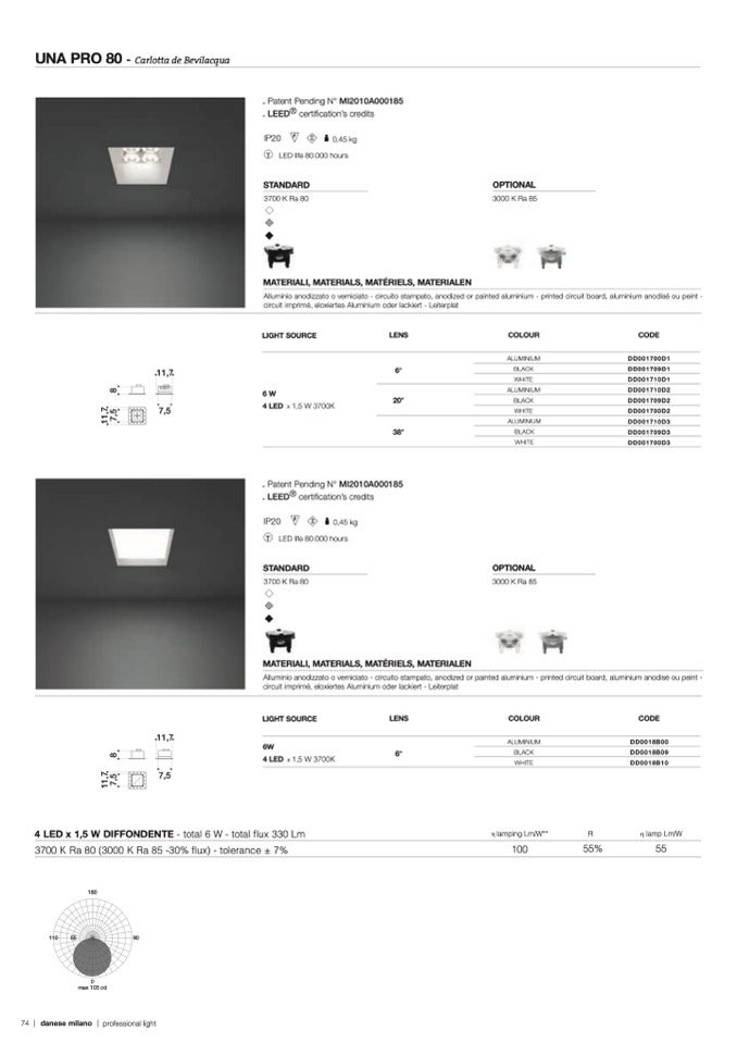 4 LED x 1,5 W DIFFONDENTE - total 6 W - total flux 330 Lm