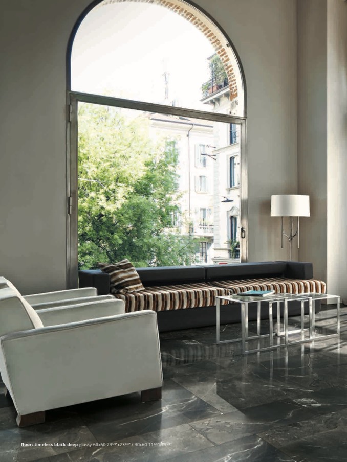 floor: timeless black deep glossy 60x60 235/8”x235/8” / 30x60 114/5”x235/8”