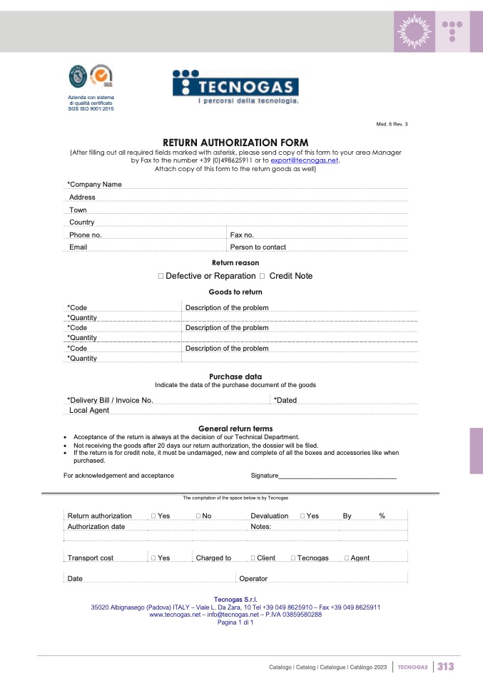 by Fax to the number +39 (0)498625911 or to export@tecnogas.net.