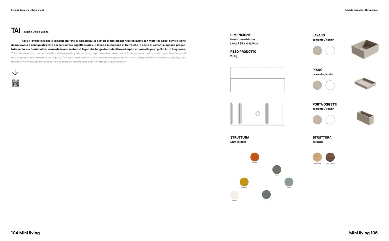 Tai is the wood and cement washbasin inspired by ‘komebitsu,’ Japanese rice boxes made from noble materials such as paulownia wood