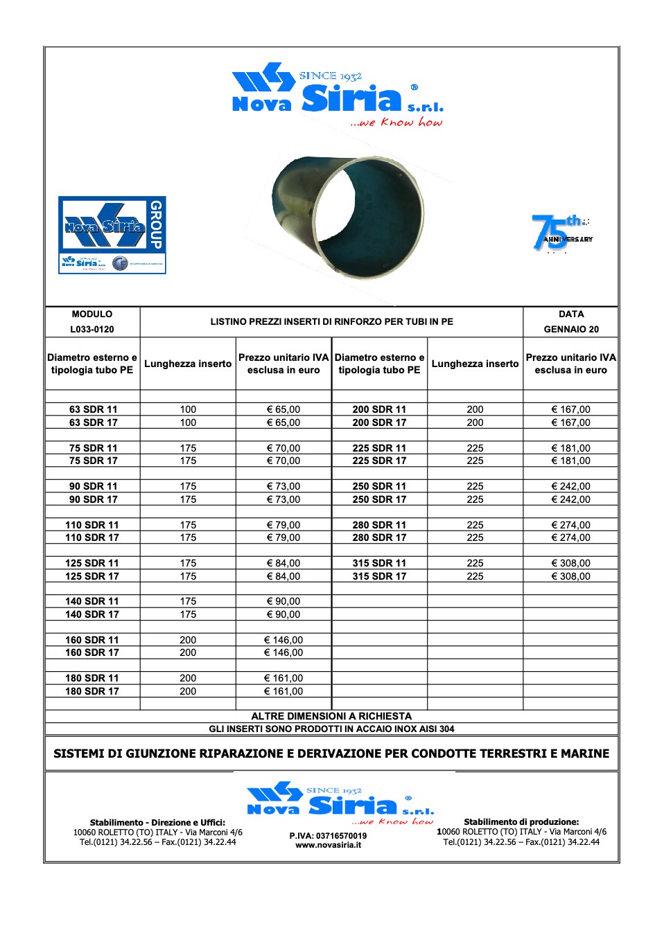 价目表 Nova Siria - Hawle Inserti di rinforzo per tubi in PE
