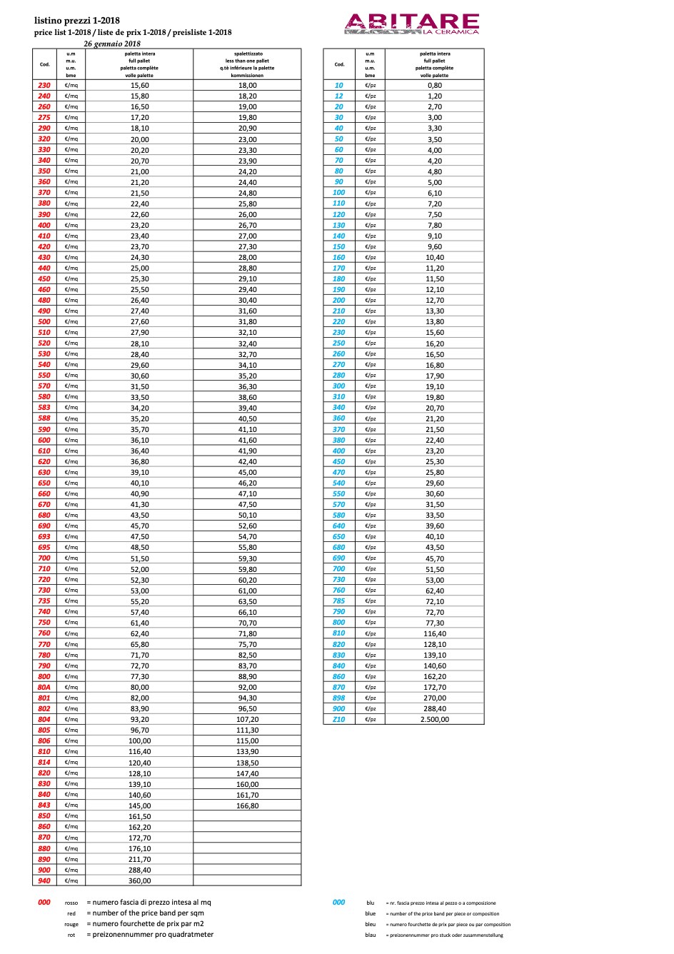价目表 Abitare 1-2018